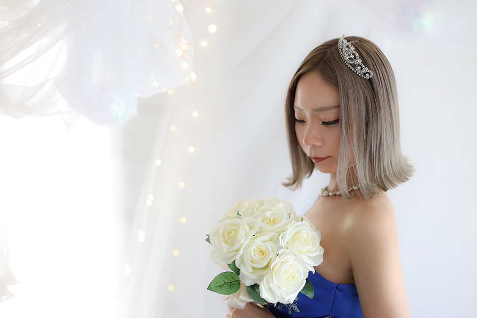ブルーのドレスと白いバラのコントラストが素敵です。