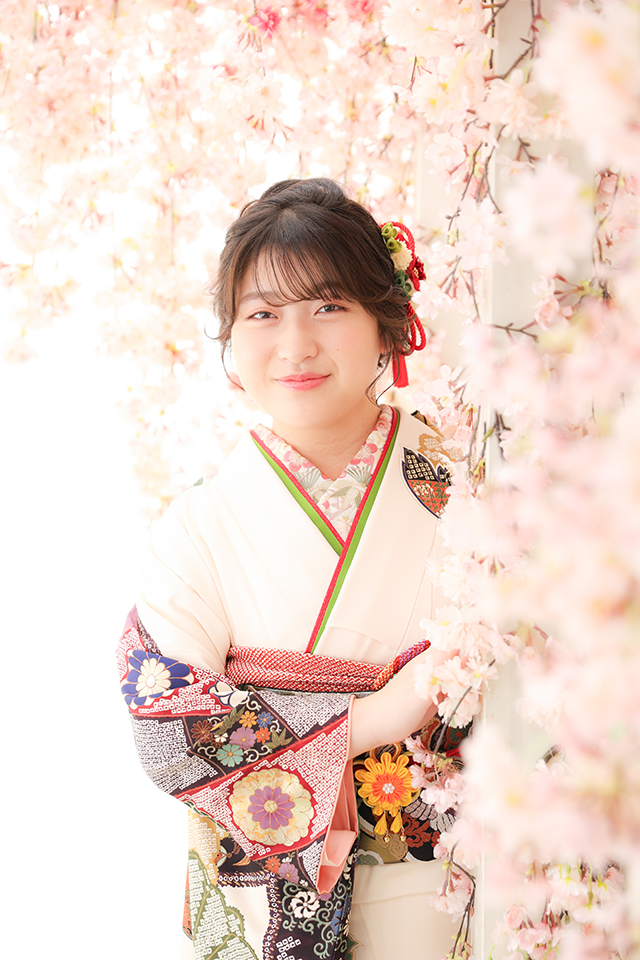 人気の撮影シーン〝満開の桜"の中でにこやかに微笑むお嬢様。
