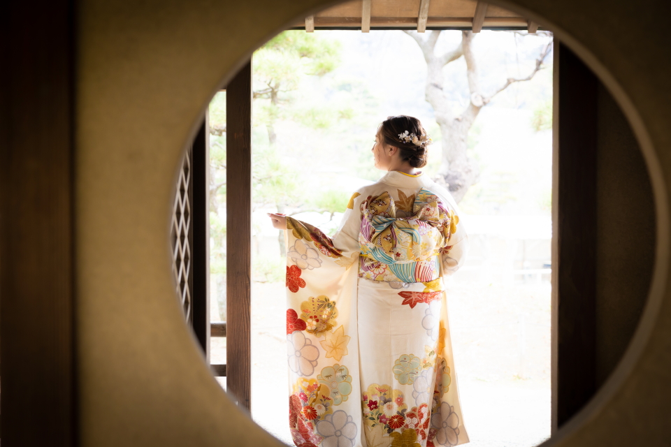三渓園の丸窓の前で大変素敵な後ろ姿をお撮りさせていただきました。
