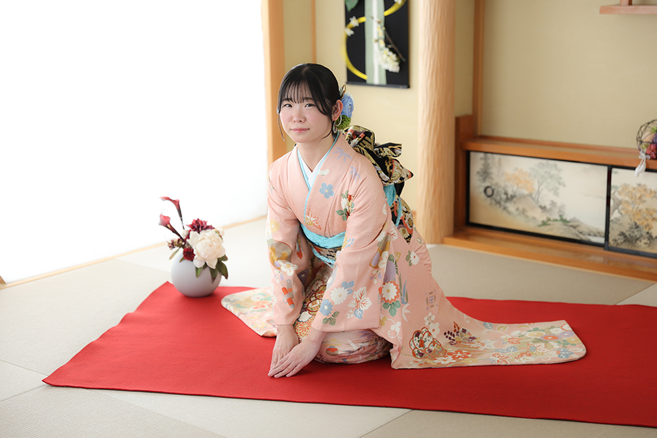 2026/03/15 「ピンクの振袖がかわいかった」 成人振袖 ブログ 市川店 市川市の写真館「振袖物語館 市川店」の成人式振袖フォトプランのお写真です。 市川店の和室スタジオで正座しているお嬢様。 お嬢様が「ピンクの振袖がかわいかった」と選ばれた 古典柄のお着物に、小物を水色でコーディネイトされ、とても素敵な仕上がりになっております。 撮影後のアンケートには「とても対応がとてもよかったので、安心できました」とコメントをいただきました。 Photo by Ichikawa 該当店舗 市川店