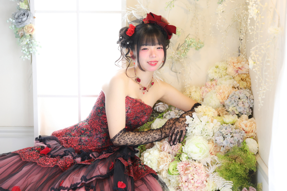 お嬢様がお召しになったのは、薔薇柄のトップスに黒のチュールやフリルをふんだんにあしらった華やかなカラードレス。