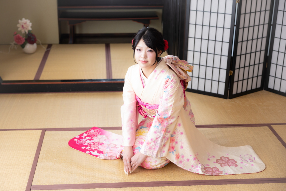 横浜店人気の和室スタジオで、振袖姿で正座をされたお嬢様。