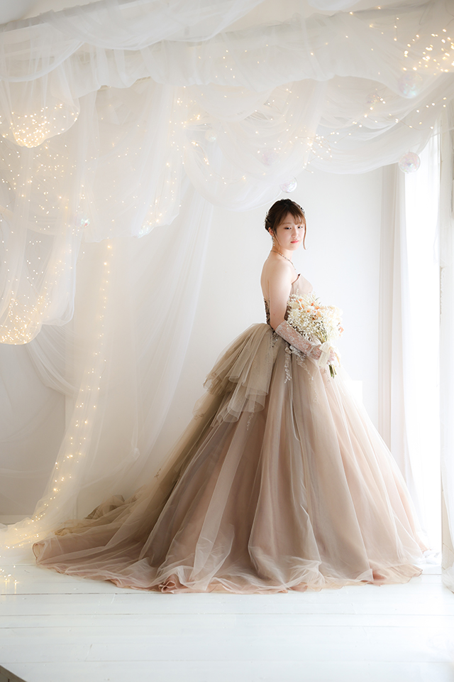 スタジオをご見学されたお客様の多くが「かわいい」と心躍らせる撮影シーンで人気のブラウンドレスで振り返っている姿がとても素敵です。