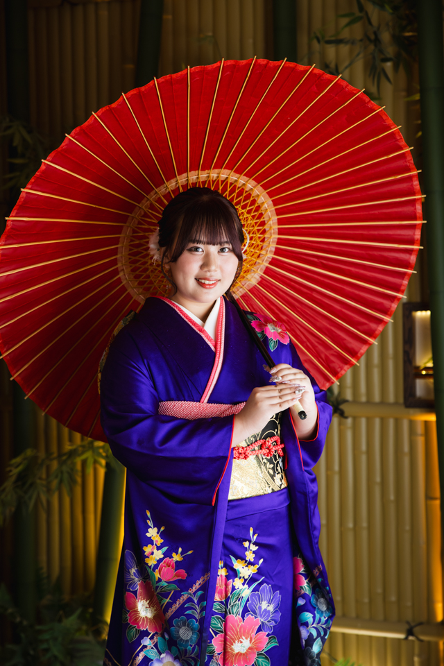 それぞれの装いにお嬢様らしさが表れ、振袖では凛とした華やかさを、ドレスでは可憐でやわらかな雰囲気を見せてくださいました。