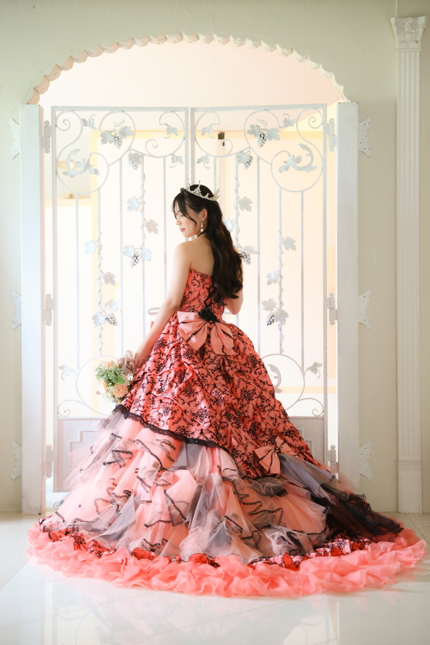 お選びいただいたのは、黒とオレンジの華やかなカラードレス。スカート部分のフリルや、大きなリボンがアクセントになった印象的な一着です。