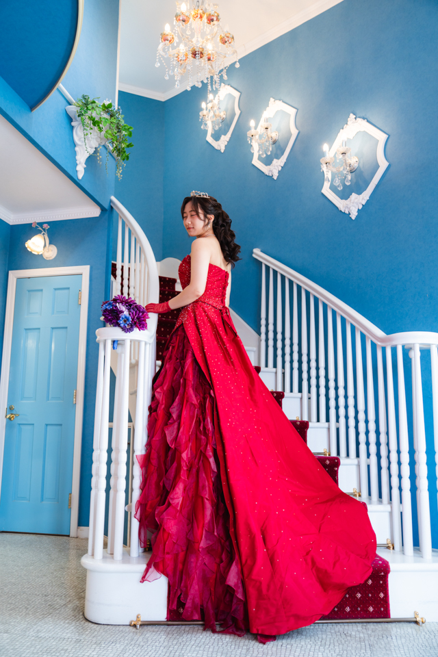 衣装選びでは「かわいさを大事にしたい」とお話しくださり、たくさんの候補の中からドレスは「せっかくなので振袖とは違う雰囲気で」と、大人っぽいシルエットのものをチョイス。落ち着いたカラーに上品なデザインが、晴れやかな表情をより引き立てていました。