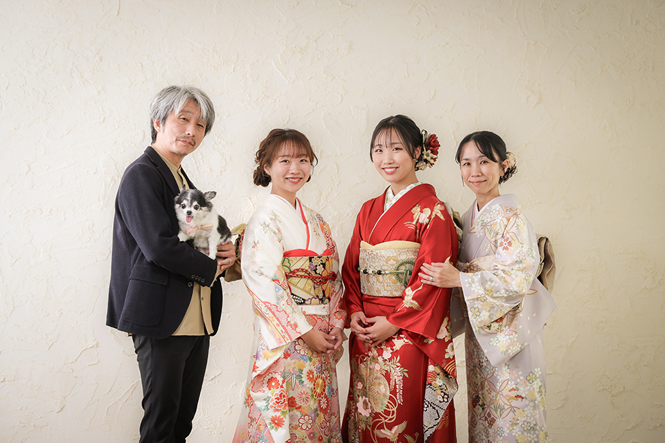 お母様とお姉様も和装にお召しになり、わんちゃんもリボンをつけてお嬢様の門出をお祝いして下さいました。