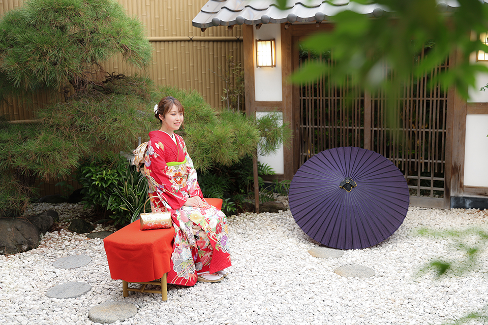 2026年の成人式にご出席予定のお嬢様。式典当日の振袖を当店でレンタル予約いただいており、今回はその前撮りで振袖とドレスの2着を撮影させていただきました。