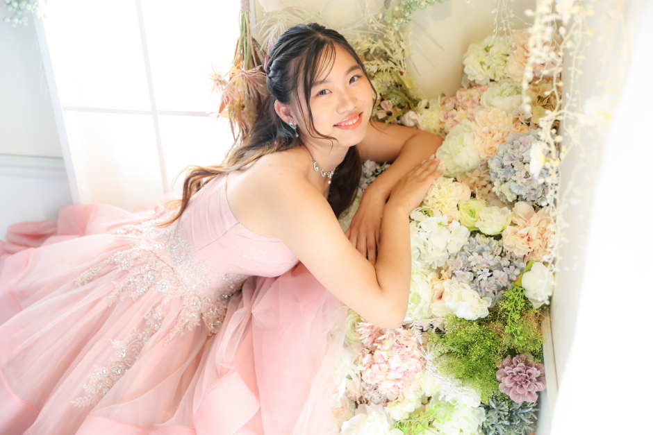 ドレス撮影では、振袖の際とは雰囲気を変え、お嬢様のご希望でハーフアップのヘアスタイルに。長く伸ばされたロングヘアを活かしたアレンジが、ドレスのやわらかな印象とぴったりマッチしていました。