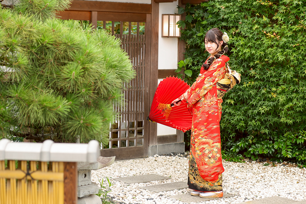 庭園スタジオで番傘を手に見返りの瞬間を撮影したお嬢様の素敵なフォトショットです。