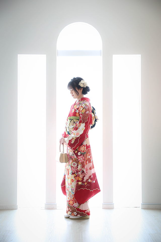 自然光が差し込むアーチ窓の前で、振袖姿のお嬢様をお撮りした素敵なポートレートです。