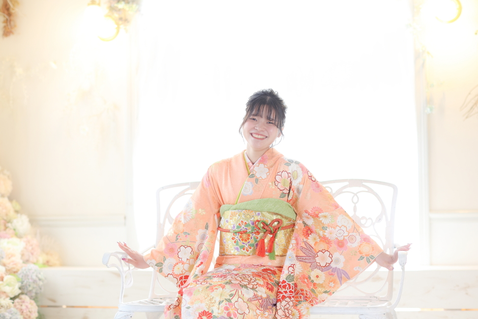 千葉市美浜区のフォトスタジオ「振袖物語館幕張本店」の成人振袖フォトプランのお写真です。ホワイトスタジオでお撮りしたお嬢様の笑顔が素敵なポートレートです。