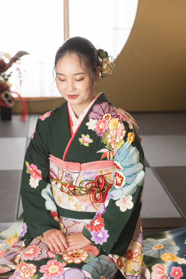 レンタル衣装選びでは「せっかくだから少し冒険してみたい」とお話しくださり、普段はあまり選ばないかもしれないカラーの振袖をチョイス。