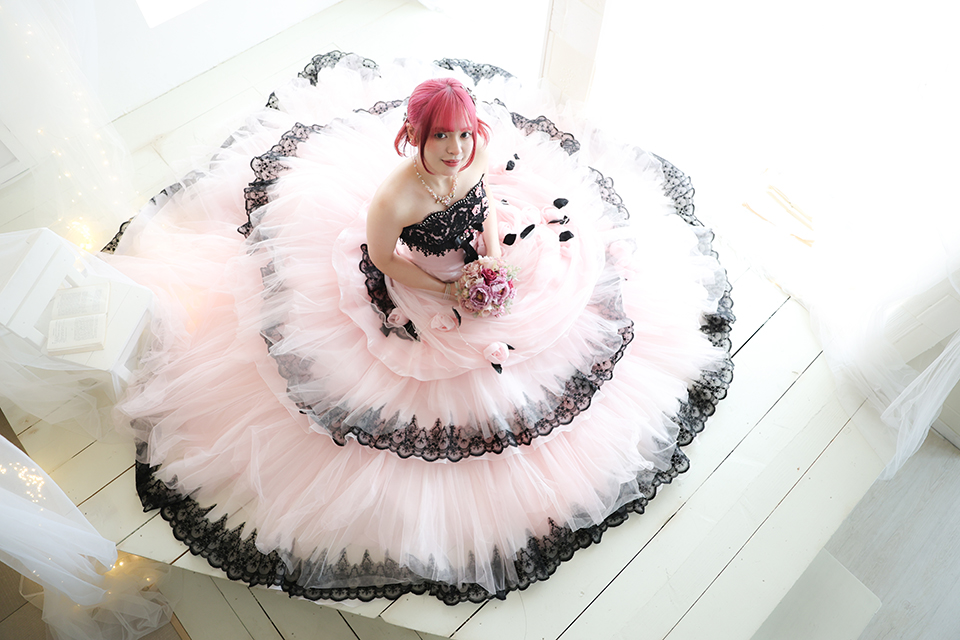 スタジオをご見学されたお客様の多くが「かわいい」と心躍らせる人気の撮影シーンでドレスを広げてお座りになられたお嬢様。