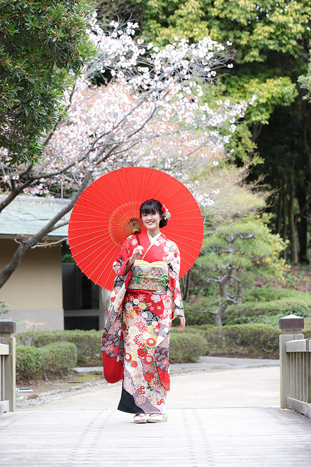 お嬢様は「桜で撮りたいので、振袖でロケ撮影が出来るから」とご来店のきっかけをお話しくださいました。