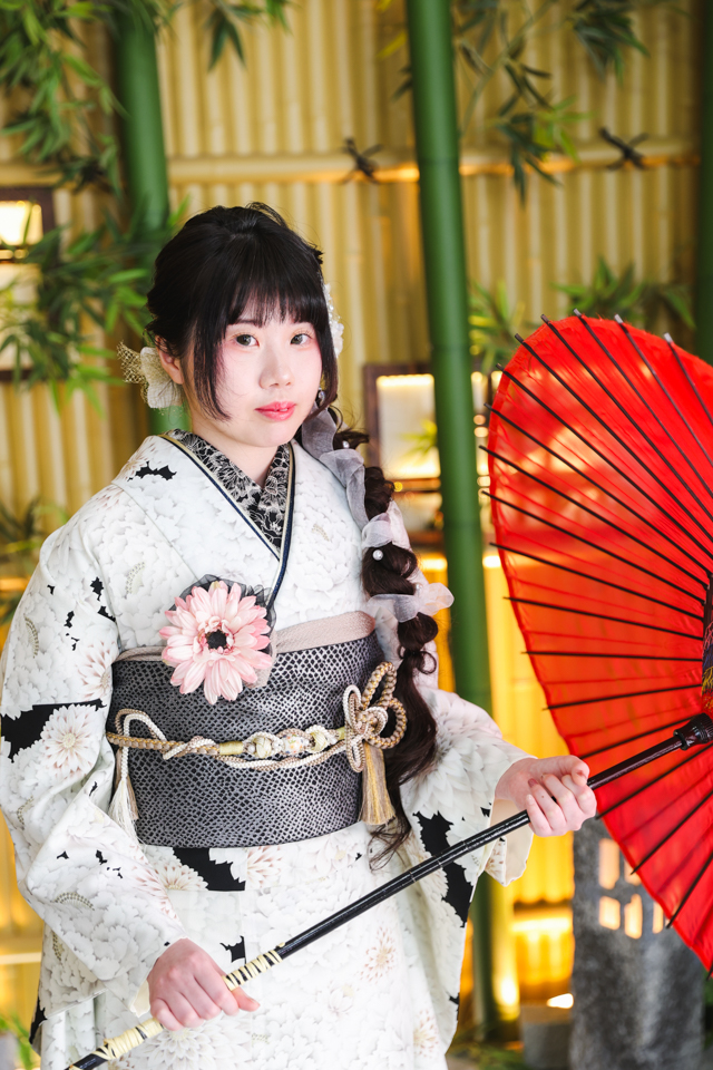 初めて当スタジオをご利用いただいたお嬢様が、成人の記念撮影にお越しくださいました。お支度と撮影では、当店の振袖とドレスの2着をお選びいただきました。